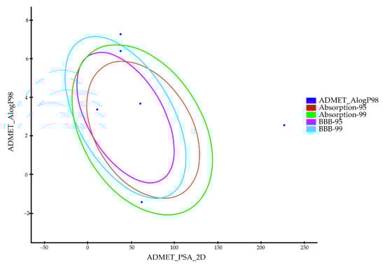 The plot of the two-dimensional polar surface area (PSA_2D) vs. the calculated ALogP98 for tested compounds showing the 95% and 99% confidence ellipses corresponding to the blood–brain barrier (BBB) and the human intestinal absorption (HIA) models.