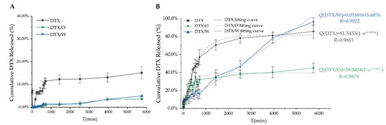 Using various mathematical models, the drug release curves were analyzed via Origin Software 2019b (OriginLab Corp., Northampton, MA, USA). Zero-order, first-order, Higuchi, Hixson–Crowell and Koresmeyer–Peppas are commonly used models used to describe drug release kinetics [47,48]. The correlation coefficient values (R) of each mathematical model for DTX, DTX/O and DTX/W are summarized in Table 4. For DTX solution and DTX/O, the first-order models of drug release had a higher R value, whereas for DTX/W, the R value of the zero-order model was 0.9922. This suggests that the drug release mechanism of DTX/O is more suitable for the first-order kinetic study, and the drug release mechanism of DTX/W is more suitable for the zero-order kinetic study.