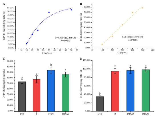 Antioxidant activity studies in vitro: (A,B) The relationship between DTX solution and DPPH scavenging rate (E%, blue) or H2O2 scavenging rate (E%, yellow); (C,D) DTX solution (DTX), blank emulsion (B), DTX/O-containing emulsion (DTX/O) and DTX/W-containing emulsion (DTX/W) had different scavenging rates on DPPH free radicals (DTX-containing concentration: 50 μg/mL) and H2O2 (DTX-containing concentration: 250 μg/mL). The data are means ± SD (n = 3). Means with different letters (a–c) are significantly different (p < 0.05) via Duncan’s test.