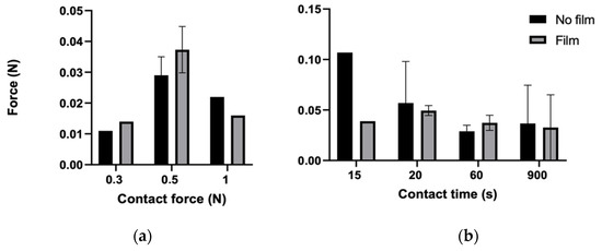 Preliminary experiments were conducted to establish the best conditions for performing the test described in Section 2.5.1. Porcine stomach was used as a substrate. Three critical parameters were selected to determine the conditions of the test: (1) the contact time between the attached and the substrate skin, (2) the force exerted during contact time, and (3) the detachment speed. The test conditions for contact time were 15, 20, 60, and 900 s. The test conditions for contact force were 0.3, 0.5, and 1 N. The detachment speed was set to 0.1 mm/s according to Hägerström et al. [3]. Hägerström et al. studied different speeds and concluded that the one that gave the best discriminative values was 0.1 mm/s. The findings of this author on the detachment speed were taken into account in the present article.