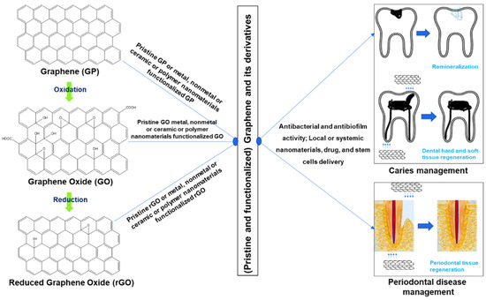 Interestingly, all these graphene derivatives can be activated and functionalized with metal and metal nanoparticles, polymers, drugs, and other small molecules. They can be used in various research fields including regeneration, drug delivery, gene delivery, protein delivery, nanoparticles release, cell and tumor imaging, physiochemical properties development of other materials, multimodal bioimaging, and cancer therapy. Figure 1 demonstrates the diverse applications of graphene materials in caries and periodontal disease management.