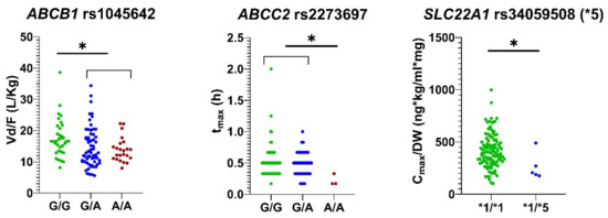Box plots representing significant associations between genotypes and pharmacokinetic parameters after Bonferroni correction for multiple comparisons. Left panel: Vd/F according to ABCB1 rs1045642 genotype; center panel: tmax according to ABCC2 rs2273697 genotype; right panel: Cmax/DW according to SLC22A1 rs34059508 genotype (*1/*1 equals to G/G, *1/*5 equals to G/A). * p < 0.001 after multivariate analysis (independent variables: sex, ethnicity, ABCB1 rs1045642 G/G vs G/A+A/A, ABCC2 rs2273697 G/G+G/A vs A/A, COMT rs4680 G/G+G/A vs A/A, CYP2C19 UM ultra-rapid metabolizer (UM) vs rapid metabolizers (RM) + normal metabolizers (NM) + intermediate metabolizers (IM) + poor metabolizers (PM), NAT2 RA vs. SA, SLC22A1*3, SLC22A1*5, UGT1A6 rs7592281 G/G vs. G/T).