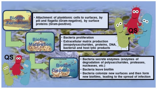 The genesis of BF is related to quorum sensing (QS), a mechanism that allows intracellular communication and regulates gene expression in response to cell density []. QS occurs in both Gram-positive and Gram-negative bacteria, but the self-inductors that are produced, and/or the signal molecules that allow cell-to-cell communication are different. In general, QS allows bacteria to begin, synchronize, and create a synergy that allows the architecture of BF to be retained and the creation of an environment within it that is conducive to the survival of pathogens [,]. There are many abiotic or living surfaces, including tissues, industrial surfaces, medical devices, dental materials, and contact lenses, on which pathogens can form BF [,].