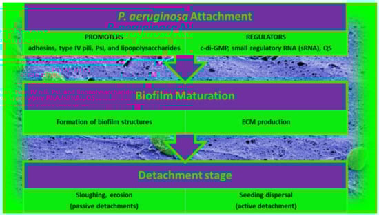 After adhering reversibly to surfaces or each other, bacterial cells undergo the switch from reversible to irreversible attachment. P. aeruginosa bacteria undergo a series of changes to adapt to the new mode of life, thus shifting from the status of planktonic cells (free-living cells) to that of sessile cells (not motile attached cells). They form a more structured architecture, termed microcolonies, in which bacteria are highly coordinated and start working together to produce ECMs and build structures and water channels. These microcolonies develop further into extensive three-dimensional mushroom-like structures, a hallmark of BF maturation. While BF matures, P. aeruginosa bacteria go through physiological modifications, thus becoming more resistant to environmental stresses and antibiotics. All this machinery is governed by a signaling system called quorum sensing (QS) [].