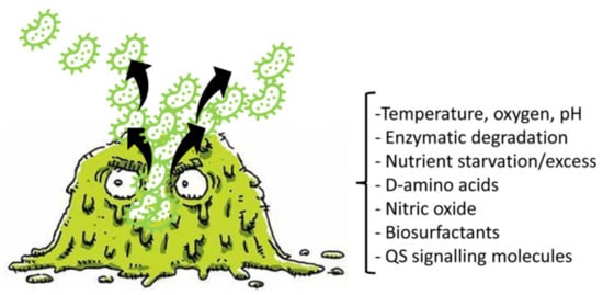 The costs associated with BF growth make it pivotal that bacteria have mechanisms to separate from BFs and return to planktonic life. This process is referred to as detachment or dispersion. Detachment is the final stage of BF development, essential to the creation of new BFs in new niches. Detachment can occur by several different mechanisms, such as sloughing, erosion, and seed dispersal [,,]. While sloughing and erosion are passive detachments and are mediated by shear stress [,], seed dispersal consists in the active disengagement mechanism of P. aeruginosa BFs, during which single planktonic cells or microcolonies are released by the center of P. aeruginosa BFs, leaving an empty cavity (central hollowing) []. This mechanism includes the degradation of ECM and the autolysis of a BF subpopulation of cells, including dormant and persistent cells. Recently, it was reported that endonuclease EndA is needed for the dispersion of an existing BF via eDNA degradation. BF dispersion can also be promoted by environmental signals, such as variations in nutrients, the availability of oxygen, nitric oxide (NO), pH, and various chemicals. Collectively, signals that cause decreases in the levels of pyoverdine and intracellular c-di-GMP and increases in flagella production induce dispersal. Moreover, metal chelators and compounds such as cis-2-decenoic acid, anthranilate, or other surfactants can induce BF dispersal [,,].