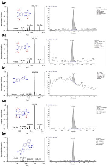 Mass spectra and extracted chromatograms of analytes at LLOQ and internal standards. (a) Product ion scan and extracted chromatogram for acetylated D-DOPA (0.03 nmol/mL); (b) Product ion scan and extracted chromatogram for acetylated L-DOPA (0.03 nmol/mL); (c) Product ion scan and extracted chromatogram of caffeic acid (0.01 nmol/mL); (d) Product ion scan and extracted chromatogram of acetylated L-DOPA-d3 (1 µM); (e) Product ion scan and extracted chromatogram of losartan (0.5 µM).