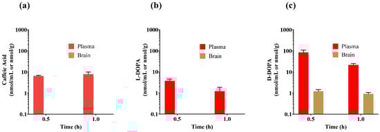 In vitro metabolic stability of (a) caffeic acid, (b) L-DOPA, and (c) D-DOPA in mouse plasma and mouse brain homogenate spiked with 10 µM concentration in respective matrix. Data expressed as mean ± standard error of mean (SEM), n = 3.