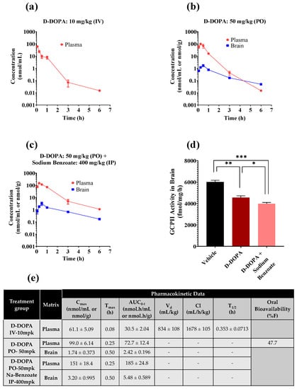 Mice were dosed IP with 400 mg/kg of the DAAO inhibitor sodium benzoate, followed by PO administration of D-DOPA (50 mg/kg). D-DOPA achieved a 1.53-fold higher Cmax (151 nmol/mL) in plasma at 15 min and a 1.84-fold higher Cmax in brain (3.20 nmol/g at 30 min) compared with D-DOPA monotherapy (Figure 4b,c). Furthermore, plasma exposures (AUCPO-plasma) improved by 2.54-fold (185 nmol.h/mL; * p < 0.05) and AUCPO-brain by 2.26-fold (5.48 nmol.h/g; * p < 0.05). Similar modulation in the PK of D-serine, a substrate of DAAO, has been reported by our group and others where D-serine combination with a DAAO inhibitor significantly decreased its clearance and increased its exposures [57,58]. The sodium benzoate combination with D-DOPA also enhanced the oral bioavailability of D-DOPA (47.7% as monotherapy versus >100% in combination) and was superior to known active site inhibitors with <5% bioavailability [59,60], with the exception of thiol-based GCPII inhibitor, that exhibit ~30–40% oral bioavailability in preclinical species [61].