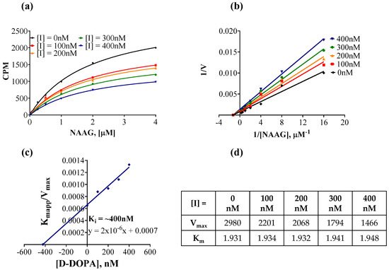 Mechanism of inhibition of GCPII by D-DOPA. (a) Rate of reaction plotted against substrate (NAAG) concentration, in the presence of several concentrations of D-DOPA. Recombinant human GCPII enzyme (40 pM) was incubated with increasing concentrations of radiolabeled NAAG and coupling reagents for 2 h at 37 °C. (b) Lineweaver–Burk plot to illustrate the non-competitive inhibition by D-DOPA. (c) Secondary plot (KM app/Vmax vs. [D-DOPA]) to obtain the binding constant (Ki = −X intercept) of D-DOPA. (d) Vmax and KM values were obtained from non-linear regression fits to Michaelis–Menten kinetics using GraphPad Prism.