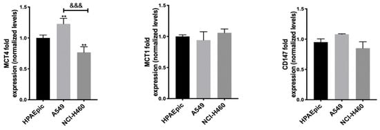 MCT1, MCT4 and CD147 expression analysis in HPAEpic, A549 and NCI-H460 cell lines, assessed by Western blot. The noncancerous cell line HPAEpic presenting a normal phenotype was used as a reference. Levels of protein expression are relative to the control cells and were normalized against tubulin. The results are presented as means ± SD of two independent experiments. ** p < 0.01 compared to HPAEpic cells (control). &&& p < 0.001 compared to A549 cells.