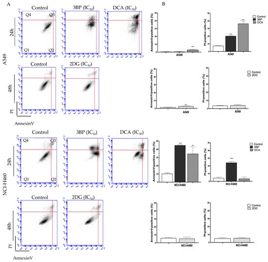 Effect of GIs on cell death after 24 h of treatment with 3BP and DCA or after 48 h with 2DG. Representative cytograms (A) and quantification of Annexin V- and PI-positive cells (B) are shown for A549 (top) and NCI-H460 (bottom) cell lines. The quadrants (Q) were defined as Q1 = live (Annexin V- and PI-negative), Q2 = early stage of apoptosis (Annexin V-positive/PI-negative), Q3 = late stage of apoptosis (Annexin V- and PI-positive) and Q4 = necrosis (Annexin V-negative/PI-positive). *** p < 0.001; **** p < 0.0001 compared to untreated cells (control).