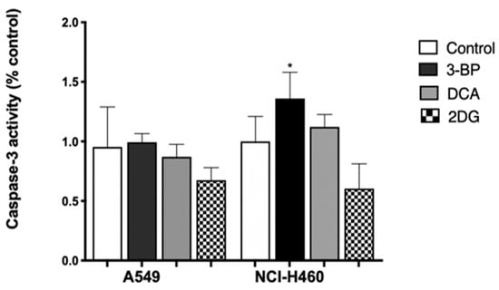 Concerning the other cell line, NCI-H460, untreated cells (control) showed a basal level of around 10% and 4% of apoptotic and necrotic cell death, respectively. In this case, and differently from A549 cells, DCA induced apoptosis only, whereas 3BP induced both mechanisms of cell death. No effect, both in apoptosis and necrosis, was observed in 2DG-treated cells. In this cell line, it was 3BP that produced the greatest effect, resulting in 70% of total cell death (45% of apoptosis and 25% of necrosis), whereas DCA significantly induced an average of 38% of total cell death (about 35% of apoptosis and 3% of necrosis). In agreement with these results, treatment with 3BP revealed an increase in caspase-3 activity. However, the increase in apoptotic cells, determined by the annexin assay for DCA-treated cells, was not confirmed, suggesting that the annexin assay is more sensitive than the caspase-3 assay. For 2DG, no increase in apoptotic rate was observed, neither through the annexin assay nor through the caspase-3 activity assay. As such, these results may suggest that 2DG induces cell death by another mechanism—likely autophagy. In fact, some authors have reported that, in vitro, 2DG induces autophagy in different tumor cell types [55,56].