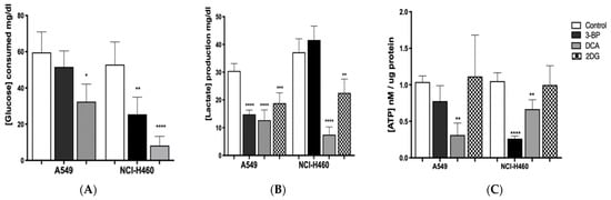 GIs exposure is expected to lead to a decrease in lactate production and glucose consumption, causing cellular ATP depletion and, consequently, cell death [58,59,60]. A549 and NCI-H460 were treated for 24 h (in the case of 3BP and DCA) or 48 h (in the case of 2DG) with IC50 values of 3BP, DCA and 2DG. After treatment, extracellular glucose and lactate and intracellular ATP were quantified and normalized against total biomass or protein, respectively (Figure 4). As expected, in treated cells, we observed, in general, a decrease in glucose consumption and in lactate and ATP production, with this effect being more evident when DCA was used.