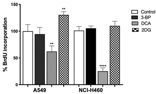 Effect of GIs on cell proliferation of lung cancer cells. The cell lines were treated with the respective IC50 of 3BP and DCA for 24 h and with 2DG for 48 h. Cell proliferation was assessed through the percentage of BrdU incorporated into the DNA of the treated cells. Results represent the mean ± SEM of a least three independent experiments, each one in triplicate. ** p < 0.01; **** p < 0.0001 compared to untreated cells (control).