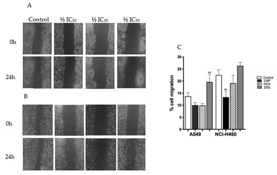 Effect of 3BP, DCA and 2DG at concentrations of 0 (control) and ½ IC50 on A549 and NCI-H460 cell migration (0 and 24 h of treatment) estimated by the wound-healing assay. (A,B) Photographic records of A549 and NCI-H460, respectively. (C) Quantitative results. Results represent the mean ± SEM of at least three independent experiments. Significantly different between groups: ** p < 0.01 compared to untreated cells (control).