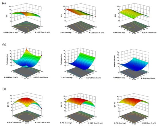As per the regression coefficients, both LF127 (X1) and GL44 (X2) concentrations disclosed a marked negative impact on PRZ EE% values, whilst a significant positive influence was evinced by PRZ concentration (X3), p < 0.0001. Obviously, LF127 concentration (X1) exerted a more prominent impact on PRZ EE%. Figure 1a represents the response surface 3D plot for the joint effect of two causal factors on the average EE% values at the intermediate level of the third factor.