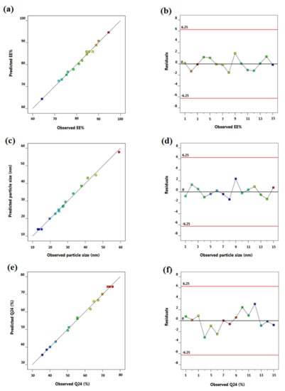 Experimental designing has been harnessed as a robust approach to mitigate the process variation, meanwhile conferring plenteous merits like accuracy, precision and prognosis [28]. Amongst diverse designing approaches, Box-Behnken design was utilized for optimization and analysis of main impacts, joint impacts as well as quadratic impacts of the process multivariable [21]. It is an incomplete three-factor three-level factorial design based on rotatable or approximately-rotatable second-order designs. Applying Box-Behnken design, the sample size is confined to a value essential for coefficients evaluation in a second degree least squares nearly polynomial form. A noteworthy feature of Box-Behnken design is that it abrogates experimental trials executed within extreme circumstances and does not simultaneously implicate combinations through which entire variables are at their minimal or maximal levels [42]. Herein, Box-Behnken design yielded 15 empirical runs for the fabrication of PRZ-PMMs with triple checkpoints as outlined in Table 2. The assembled formulations were scrutinized for EE% (Y1), micelle size (Y2) and Q24h (Y3) as dependent responses. The estimation of signal-to-noise ratio is warranted to verify model adequacy to cruise through the space outlined by the design [43]. In all analyzed responses, the recommendable ratio of four and beyond was remarked, Table 3. Alternatively, prognosticated R2 was recorded for speculation of model integrity to forecast the value of the modeled response [44]. The algorithmic variance between the adjusted and prognosticated R2 values should be around 0.2 to be in a sensible agreement [45]. It is worth mentioning that the values of the prognosticated and adjusted R2 were harmonious in the three measured responses. Notably, too small coefficient of variation was noticed for the polynomial quadratic model in all the three responses emphasizing the model aptitude for exploring the design space. Analysis of the regression models of the observed responses spanning adequate precision, R2, SD as well as %CV are compiled in Table 3. Additionally, 3D response surface graphs overtly display the effects of causal factors on the recorded responses as per the Box-Behnken design, Figure 1. Furthermore, Figure 2 quantitatively correlates the actual versus prognosticated values for the various responses besides their residual plots.