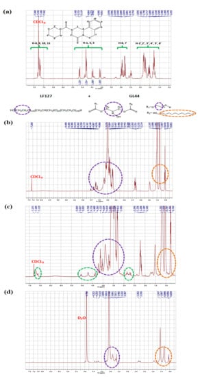 After lyophilization of PRZ-PMMs employing a Novalyphe-NL 500 freeze-dryer (Savant Instruments, Holbrook, NY, USA), the drug-loading attributes of the micelles were inspected by recording 1H NMR spectra of PRZ, blank PMMs and PRZ-PMMs in deuterated chloroform (CDCl3) on a Bruker Avance III 400 MHz NMR spectrometer (Bruker AG, Zurich, Switzerland) at ambient temperature. For contrasting purposes, 1H NMR spectra of PRZ-PMMs were recorded in deuterated water (D2O) [29]. Chemical shifts were quoted in δ, allied to that of the solvents and determined from residual protons in CDCl3 or D2O. A lag interval of 15 min in every spectrum enabled a stabilized sample temperature prior to data acquisition [30].
