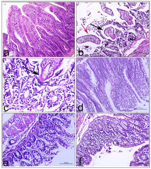 Intestines of rats from different groups were gathered and instantly fixed for 24 h in neutrally buffered 10% formalin. Wet tissue sections were dehydrated through a series of alcohols and embedded in paraffin. Serial 4 μm thick cuts were made on all paraffin blocks by rotatory microtome. Thereafter, the cuts were fixed on glass slides and the paraffin was removed. After rehydration, hematoxylin and eosin (H&E) stain was applied according to the method of Bancroft and Gamble [38] for histopathological evaluation using Olympus (model BX53) light microscopy.