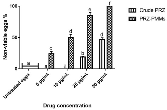 The activity of PRZ and PRZ-PMMs, against H. nana eggs, was investigated using Fuchsin vital stain [39,40]. In eppendorf tubes, 100 H. nana eggs freshly deposited from the control untreated rats, were suspended in saline and incubated at 25 °C for 15 min with 0, 5, 10, 25 and 50 µg/mL of PRZ or PRZ-PMMs. Three tubes for each concentration of each formulation were prepared. On clean glass slides, 100 µL of eggs of the different treatments were added and stained with 20 µL of freshly prepared Fuchsin for 10 min and examined under a light microscope.