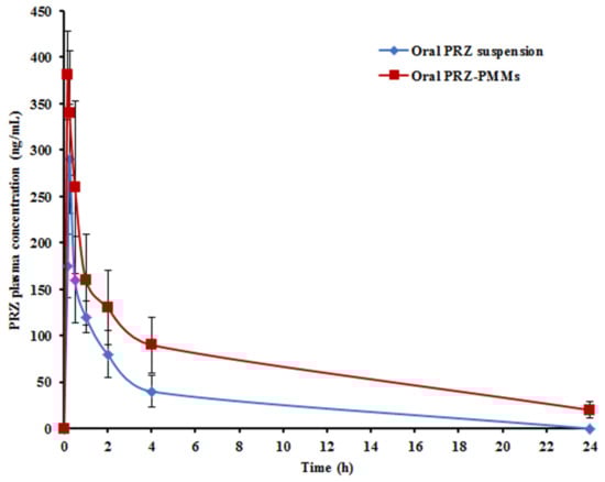 The non-compartmental pharmacokinetic analysis function built into the Excel Add-In software, PK Solver, was employed to analyze the time course of the PRZ concentration in rat plasma for estimation of pharmacokinetic parameters [25,28]. The software assesses the maximal drug concentration (Cmax, ng/mL) and elapsed time to attain such concentration (Tmax, h) directly from the plasma concentration–time curve. The software adopts the trapezoidal rule method for quantifying the area under the curve (AUC) from 0 to t (AUC0–t, ng h/mL) and from 0 to infinity (AUC0–∞, ng h/mL). Ultimately, relative bioavailability (Frel, %) of oral PRZ-PMMs was computed considering oral PRZ suspension as a standard.