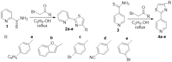 In their attempt to identify new antimicrobial compounds, Eryılmaz et al. [] designed and synthesized different hybrid pyridine derivatives bearing in the 2- and 4-position of the ring of a thiazole moiety. The synthesis was straight and efficient, involving a Hantzsch cyclocondensation of pyridine-2- and 4- carbothioamide 1 and 3 with acetophenone derivatives, when the desired hybrid 4-(R-2-yl)-2-(pyridin-2-yl)thiazole 2a–e and 4-(R-2-yl)-2-(pyridin-4-yl)thiazole 4a–e are obtained, Scheme 1. The synthesized compounds were tested for their antibacterial activity [four strains, Gram-positive (Bacillus cereus, Staphylococcus aureus) and Gram-negative (Escherichia coli, Pseudomonas aeruginosa)] and antifungal activity (one strain, Candida albicans) via minimal inhibitory concentration (MIC) method and DNA cleavage activity studies. The authors established interesting correlation structure-biological activity (SAR), the most relevant finding being that 4-pyridine thiazole hybrid compounds 4a–e showed more potent activity than 2a–e. The most promising compound was found to be 4c (MIC values 0.01 mM) exhibited on the bacterial strains Staphylococcus aureus and Bacillus cereus.