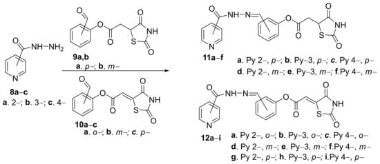 Trotsko et al. [] designed and synthesized different hybrid pyridine derivatives bearing at the 2-, 3- or 4- position of the ring of a thiazolidine-2,4-dione moiety. The synthesis involve a condensation reaction of hydrazonyl-pyridine 8a–c with the corresponding (2,4-dioxo-1,3-thiazolidin-5-yl/ylidene) 9a,b/10a–c, which are leading to the desired hybrid pyridine-2,4-dioxo-1,3-thiazolidin-5-yl derivatives 11a–f or pyridine-2,4-dioxo-1,3-thiazolidin-5-ylidene derivatives 12a–i, Scheme 3.