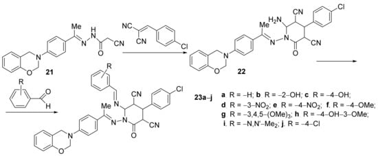 Desai et al. [] have studied the in vitro antimicrobial activities of some newly hybrid oxazino-pyridine derivatives. The desired compounds, oxazin-3(4H)-yl)phenyl)ethyildene)amino)-6-((arylidene)amino)-4-(4-chlorophenyl)-2-oxo-1,2-dihydropyridine 23a–j, were synthesized in two steps, by cyclocondensation of oxazine 21 followed by condensation of the intermediate 22, Scheme 5.