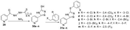 Ahirwaret al. [] synthesized two new series of some 1,3,4-triazolo-pyridine hybrid derivatives and studied their antimicrobial activities. The synthesis was conducted in two steps: a cyclocondensation reaction of dithiocarbazate 29 with ammonia leading to the first class of hybrids triazolo-pyridine 30a–n, then an alkylation reaction of 30a–n with benzyl halide takes place leading to the second class of hybrids triazolo-pyridine 31a–n, Scheme 8.