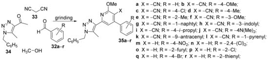 Jaabil et al. [] have studied the in vitro antimicrobial activities of some newly hybrid 1,2,3-triazolo-pyridine derivatives. The synthesis was green and efficient, under grinding strategy at room temperature, involving one-pot sequential multicomponent reactions of aryl aldehydes 32a–r, malonitrile 33, methanol and 1,2,3-triazolyl ketone 34, when the corresponding 1,2,3-triazolyl-pyridine/cyanopyridine hybrids 35a–r were obtained, Scheme 9.
