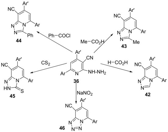 The synthesis of triazolo-pyridines 42–45 and tetrazolo-pyridines 46 use as starting material the same intermediate, the 6-(3,4-dimethylphenyl)-2-hydrazinyl-4-(thiophen-2-yl)-pyridine-3-carbonitrile 36, which react with the appropriate formic acid, acetic acid, benzoyl chloride, carbon disulfide, respectively, sodium nitrite, to produce the desired hybrid derivatives 42–45 and 46, Scheme 11.