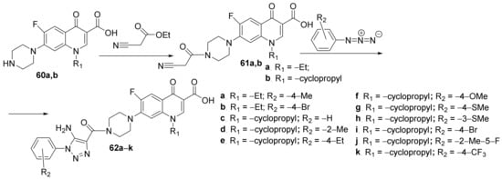 Hryhoriv et al. [,] synthesized two new classes of hybrid derivatives analogous to fluoroquinolones, namely piperidino-quinoline 61a,b and 1,2,3-triazolo-piperidino- quinoline 62a–k, and studied their antimicrobial activities. The first class of hybrids was obtainedviaan N-alkylation reaction of piperidino-quinoline 60a,b, when the N-substituted-piperidino-quinoline hybrids 61a,b are obtained. A click cyclocondensation reaction of 61a,b occurs to the second class of hybrids, the 1,2,3-triazolo-piperidino-quinoline 62a–k, Scheme 14.