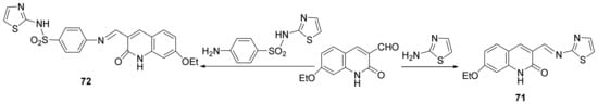 Ammar et al. [] synthesized a series of thiazole-quinoline hybrids and studied their antimicrobial properties. In order to synthesize the desired compounds, they used the condensation reaction between formil-quinoline derivatives with amino-thiazole or sulfathiazole, when the desired Schiff’s base thiazole-quinoline 71 and 72, are obtained, Scheme 18.