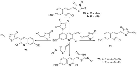 Further, the condensation reaction between formil-quinoline derivatives with different thiazolone derivatives lead to hybrid thiazolone-quinoline derivatives 73–76, Scheme 19.