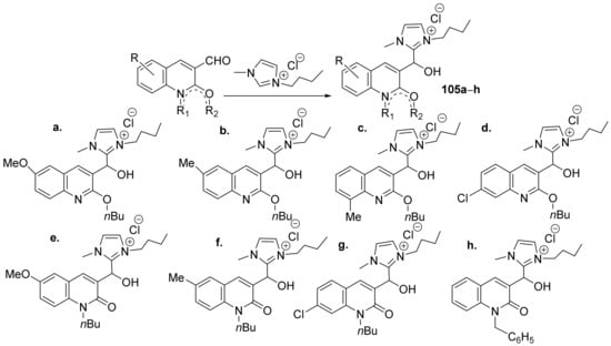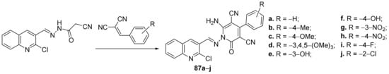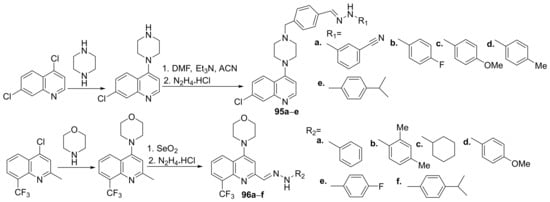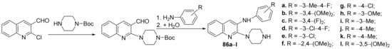 Lagdhir et al. [] synthesized a library of piperazin-quinoline hybrids and studied their antimicrobial properties. The reaction pathway involves two steps (an alkylation and a condensation reaction), leading to the piperazin-quinoline hybrids 86a–l, Scheme 22.