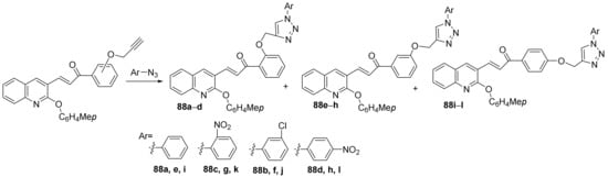 Awolade et al. [] synthesized a library of triazole-quinoline hybrids and studied their antimicrobial properties. The reaction pathway is straight involving click chemistry of various azides with triple bond derivatives, via copper(I)-catalyzed azide-alkyne 3 + 2 dipolar cycloaddition reactions, Scheme 17.