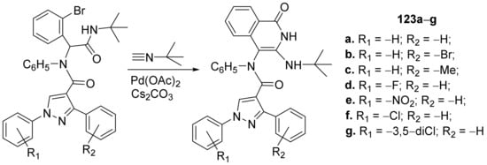 - Pandya, K.M.; Battula, S.; Naik, P.J. Pd-catalyzed post-Ugi intramolecular cyclization to the synthesis of isoquinolone-pyrazole hybrid pharmacophores & discover their antimicrobial and DFT studies. Tetrahedron Lett. 2021, 81, 153353. [Google Scholar]