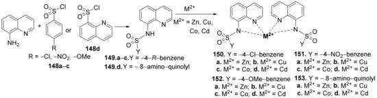 Reaction pathway to obtain metal-quinoline hybrids 64a–d.
