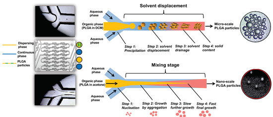 - Xu, J.; Zhang, S.; Machado, A.; Lecommandoux, S.; Sandre, O.; Gu, F.; Colin, A. Controllable microfluidic production of drug-loaded PLGA nanoparticles using partially water-miscible mixed solvent microdroplets as a precursor. Sci. Rep. 2017, 7, 4794. [Google Scholar] [CrossRef] [PubMed]