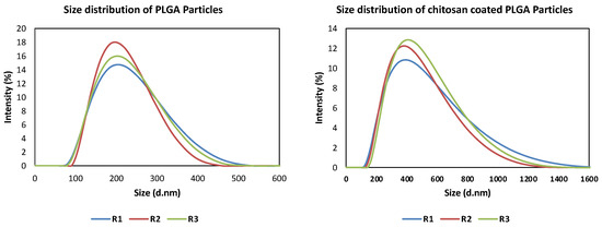 Size distribution by intensity of the uncoated PLGA and CS-PLGA particles. R1, R2, and R3 denote the replicates R1, R2, and R3, respectively.