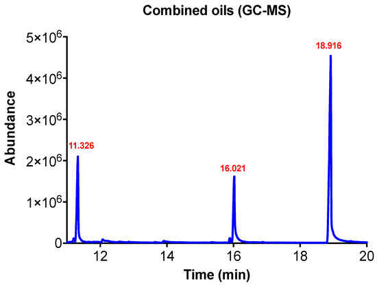 Chromatogram of the combined EO components encapsulated in the prepared particles with retention times 11.326, 16.021, and 18.916 for linalool, geraniol, and eugenol, respectively.