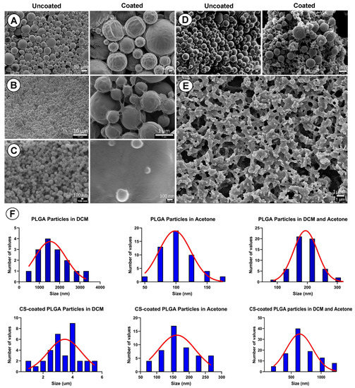 SEM micrographs showing the PLGA particles prepared using different conditions. (A) Uncoated and CS-PLGA particles prepared by conventional method. (B) Uncoated and CS-PLGA particles prepared by microfluidics using DCM as EO solvent. (C) Uncoated and CS-PLGA particles prepared by microfluidics using acetone as EO solvent. (D) Uncoated and CS-PLGA particles prepared by microfluidics using a DCM: acetone (1:10) as EO solvent. (E) Scaffold structure of chitosan. (F) Histogram of the actual particle size distribution in the EM images analyzed using ImageJ software.