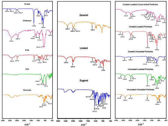 The FTIR spectra of pure PLGA, PVA, chitosan, and EO components were analyzed to confirm the encapsulation of EO components within the prepared particles, successful coating of PLGA particles with chitosan, and cross-linking with TPP (Figure 5). The characteristic peaks of PVA were detected at 3306 cm−1, 1732 cm−1, 1427 cm−1, and 1327 cm−1 corresponding to stretching vibration of –OH group, stretching vibration of –C = O group, and bending vibrations of –CH2 and –CH3 groups, respectively. The chitosan exhibited two sharp peaks at 1648 cm−1 and 1590 cm−1 relating to the primary and secondary amides, and signals of C–H stretch and C–H bend at wavenumbers 2882 cm−1 and 1376 cm−1, respectively, as well as characteristic peak of N–H stretch at 3358 cm−1. The PLGA was recognized with absorption bands at 1746 cm−1 for C = O stretching, 866–1452 cm−1 for C-H bending, 3507 cm−1 for OH stretching, and 2946 cm−1 for CH2 stretching. The absorption bands of 1209 cm−1, 1136 cm−1, 1095 cm−1 and 887 cm−1 were observed in the TPP spectra corresponding to P = O, -PO2, -PO3 and P-O-P stretching, respectively. Sucrose was used as a cryoprotectant and showed specific bands at 907 cm−1, 988 cm−1 and 1065 cm−1 in the fingerprint region. The three EO components showed a broad peak at 3300 cm−1 relating to alcohol OH stretch. Linalool and geraniol spectra indicated intense peaks in the region of 918 cm−1, 1111–1451 cm−1 and 2969 cm−1 due to stretching vibrations of C-C, C-O, and C-H groups, respectively. Eugenol had spectral signal frequencies at 817 cm−1, 994 cm−1, 1431 cm−1, and 1605 cm−1 assigned for ring deformation, trans CH out-of-plane, CH2 vibration, and presence of C = C group region, respectively. The spectrum of CS-PLGA particles compared with uncoated and crosslinked particles confirmed chitosan adsorption to the surface of particles and successful TPP crosslinking. On the other hand, the spectra of loaded particles compared with the corresponding plain particles showed the encapsulation of EO components.
