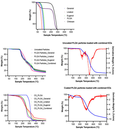 As shown in Figure 6, TGA analysis revealed the thermal stability of pure EO components, prepared particles, and the chemical derivatives used in the formulations based on the degradation temperatures where the significant weight loss was recorded. Derivative thermogram indicated one mass loss step with peak degradation temperatures between 108–162 °C, 78–135 °C, 103–178 °C, and 198–398 °C for geraniol, linalool, eugenol, and PLGA, respectively. Regarding the TGA curve of chitosan, two endothermic peaks were identified at 90 °C and 299.7 °C. On the other hand, PLGA or CS-PLGA particles loaded with EO components had a characteristic peak of EO components within the endothermic peak of PLGA or chitosan indicating the encapsulation of EO components, confirming the previous results of loading capacity 21%. The degradation temperature of the encapsulated EO components was shifted toward a higher temperature than free EO components (210 °C in PLGA particles and 250 °C in CS-PLGA particles), indicating enhancement of thermal stability of EO components.