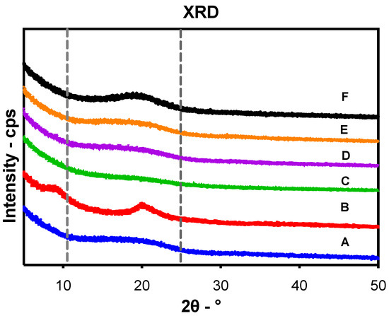 Powder X-ray diffractograms of (A) PLGA, (B) chitosan, (C) uncoated PLGA particles, (D) uncoated PLGA particles loaded with combined oils, (E) CS-PLGA particles, and (F) CS-PLGA particles loaded with combined EO components.
