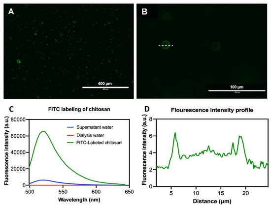 Representative fluorescence images of FITC-labeled CS-PLGA particles (A,B). FITC labelling evaluation (C) and fluorescence intensity profile across the center of the particles (D).