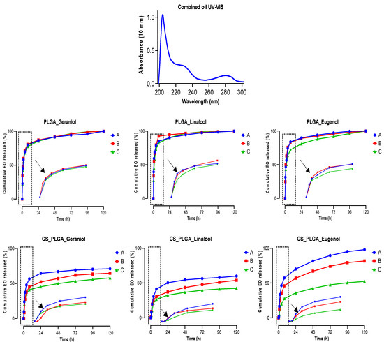 In vitro release kinetics of EO components from the uncoated and CS-PLGA particles over 120 h in hydrochloric acid-potassium chloride buffer, acetate buffer, and phosphate buffer saline denoted as A, B and C, respectively. The data are presented as average cumulative EO components release % with standard errors (1.4:2.8%). The top graph shows the absorbance band of geraniol, linalool, and eugenol detected at wavelengths of 210, 228, and 282 nm, respectively.