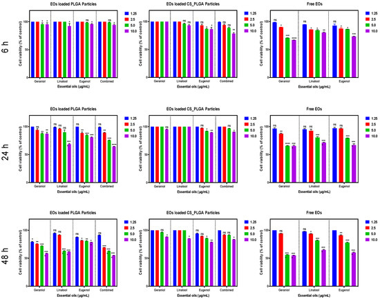 Based on the results of the optimization experiment, a seeding density of 2 × 104 cells/well was chosen because it was the minimum number of cells that allows the detection of differences in cell growth at 48 and 74 h (Figure S5). The cytotoxic effect of free and encapsulated EO components (at concentrations 1.25, 2.5, 5.0, and 10.0 μg/mL) in uncoated and CS-PLGA particles on the viability of FKD-1-R cells was estimated by using MTT assay at 6, 24, and 48 h post exposure (Figure 10). The results showed that the free essential oils exerted a significant cytotoxicity at a concentration > 2.5 μg/mL over the entire period of the experiment. The encapsulation of EO components within the PLGA induced a modest decrease in cell viability after treatment for 6 h at a concentration of 10 μg/mL and the maximum cytotoxic effect was observed at 24 and 48 h even at <2.5 μg/mL concentration of EO components, probably attributed to the rapid burst release phase of the PLGA particles (77.2–85.4% of EO components were released). Interestingly, the encapsulated EO components within CS-PLGA particles did not show any significant difference in cell viability percentage compared to the negative control up to 5 μg/mL at the three-time points, which may be attributed to the delayed onset and reduced intensity of the burst release phase, in addition to the slower release of EO components from the CS-PLGA.