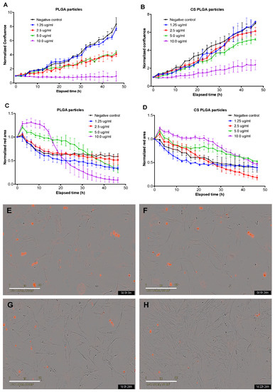 A real-time live cell analysis was used to evaluate the effect of exposure of FKD-1-R cells to different concentrations of PLGA and CS-PLGA particles loaded with EO components compared with cells treated with the same concentrations of free combined EO components. The analysis was based on the procedures described previously [26]. Firstly, the FKD-1-R cells were seeded into 96-well tissue culture microtiter plates at a seeding density 1 × 104 cells/100 µL/well and incubated for at least 16 h to allow cell adherence. The medium was carefully aspirated and replaced with fresh medium supplemented with IncuCyte® Cytotox Red (250 nM concentration for counting dead cells) and containing the combined EO components at concentrations 1.25, 2.5, 5, and 10 μg/mL either in the loaded particles or in free form (triplicate well for each condition). The plain particles were used as negative control and the blank wells contained only DMEM. The plates were incubated in IncuCyte® Live-Cell Analysis System (Essen BioScience, Berlin, Germany) fitted within CO2 incubator set at 37 °C and 5% CO2. The integrated IncuCyte® S3 software photographed three fields of view of each well every 3 h with 10x objective lens over 48 h. The levels of confluency and growth curves were generated for evaluation of cell proliferation % compared to negative controls. The cytotoxic effect of the loaded particles was estimated as red fluorescence area (µm2), which reflects the loss of cell membrane integrity and uptake of the nucleic acid dye, yielding a hundred-fold increase in the fluorescent signal.