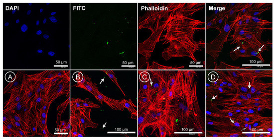 Cellular tracking of FITC-labelled CS-PLGA particles loaded with EO components was visualized using confocal laser scanning microscopy (CLSM) as described previously [27]. The FKD-1-R cells were seeded into a special cell imaging 96-well tissue culture plates (Black wall/clear flat bottomed; Falcon®353219, Corning, NY, USA) at density of 103 cells/200 µL/well and incubated at 37 °C in 95% humidity and 5% CO2. The following day, the cell culture medium was carefully aspirated and replaced with fresh prewarmed medium containing FITC-labelled CS-PLGA particles in concentrations of 0, 1.25, 2.5, and 10 µg/mL. After 24 h incubation, the media were gently removed, and the cells were washed three times in DPBS followed by fixation with 4% methanol-free formaldehyde in DPBS at room temperature for 30 min. The fixed cells were washed several times before permeabilization with 0.1% Triton X-100 in DPBS for 5 min. The permeabilized cells were rinsed with DPBS 3 times/each 5 min followed by staining of the actin filaments (F-actin) using phalloidin and the nuclear counterstain DAPI. Firstly, a 100 µL of diluted phalloidin (1 µL of 1000x phalloidin mixed in 1 mL PBS + 1% BSA) was added to each well and the cells were incubated at room temperature for 90 min. Finally, the cells were washed once with DPBS and treated with DAPI (1:1000 in PBS) for 10 min at room temperature in a dark place followed by several washes in DPBS prior to cell imaging using a laser scanning confocal microscope (Leica SP5, Wetzlar, Germany), fitted with appropriate filter for each fluorescence signals at Ex/Em = 350/470, 495/519 and 556/574 nm for DAPI, FITC and phalloidin, respectively.
